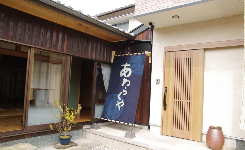 2022年3月10日、助成制度に応募し「藍のれん」を掲げた吉野川市川島町の『民宿あわらくや』。大谷焼や遊山箱など徳島らしさを取り入れた宿の新しい「顔」として、藍のれんがお客様のお出迎えしています。