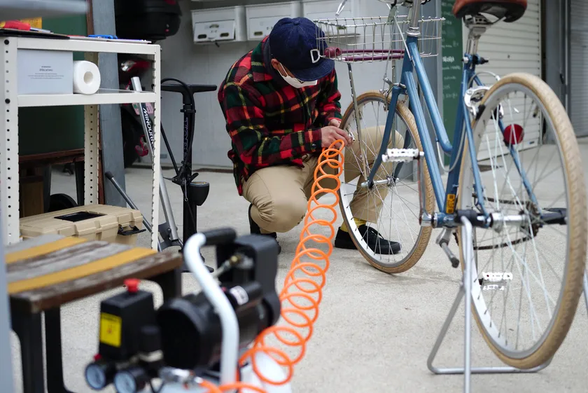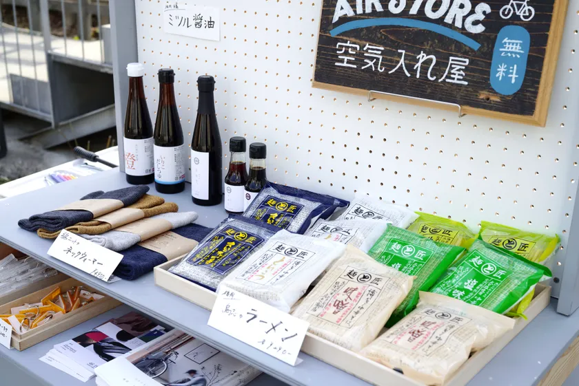 AIR STOREでは、無料空気入れサービスの他にも、出店場所のニーズに応じて自転車の健康診断サービスも実施。自転車を、永く快適に楽しんでもらうために従事しながら、普段店舗で扱っている日用雑貨の一部を販売して出張費を賄っています。