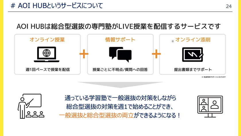 この授業コース「AOI HUB」はこの総合型選抜入試専門塾AOIがLIVE授業を配信する授業です。週1回ペースで授業を配信する「オンライン授業」授業ごとに不明点や質問の回答などを行う「情報サポート」、提出書類までサポートする「オンライン添削」で構成されており、総合型選抜入試に必要な要素は網羅できるように授業設計されています。