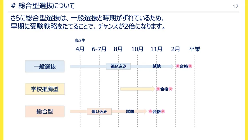 しかし、総合型選抜入試の認知度がまだ低いのが現状・・・だからこそ今がチャンスです。総合型選抜入試は一般選抜入試より倍率が半分になっているため志望校合格への可能性が上がります。また、一般入試と時期がずれているため早期に受験戦略を立てることでチャンスが2倍になります。総合型選抜入試に取り組むことで言語能力が向上し、一般選抜の教科の理解促進につながります。
