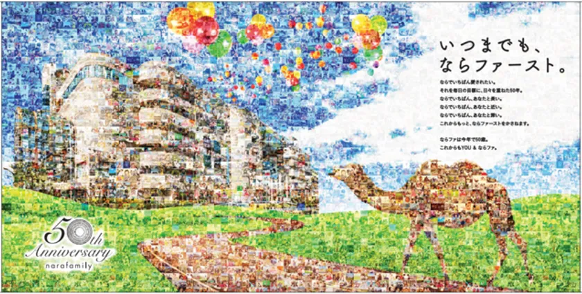 ■50周年へ向け49周年から始めたメモリアル企画「みんなでつくるモザイクアートTHANKS MEMORY DAYS」がいよいよ完成!お客さまの笑顔写真をつみかさねた「モザイクアート」が大型パネルで、ならファ館内に登場!