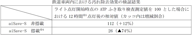本検証は、目に見えない有機物汚れを高感度に検出できるATPふき取り検査(A3法)※3によりaiSave-Sを搭載した車両と、非搭載の車両の検査測定値を比較する手法で実施したもので、鉄道車両内の除菌効果を模擬するものです。