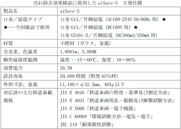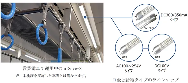 ※4 1両に搭載された全24本の40W直管型ランプのうち、20本をaiSave-Sに交換して検証を行いました。なお、検証に使用したaiSave-Sの主な仕様は、下表のとおりです。