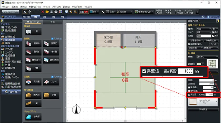 これまで同様、和室を配置し、襖や障子など建具を配置したのち、和室の「部屋プロパティ」にて、「真壁造」にチェックを入れ、長押しの設置高を数値で指定するだけで操作は完了です。
