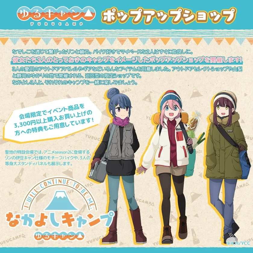大人気アニメ『ゆるキャン△』のポップアップショップ開催決定! なでしこ、リン、綾乃の「なかよしキャンプ」がテーマ!