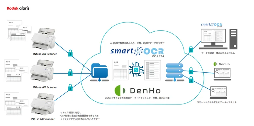 特徴:コダック アラリスの「INfuse AXスキャナー」および「INfuse スマートコネクテッド スキャニングソリューション」を使用することによりPCレスで簡単・安全にスマートOCR(DenHo)へ連携