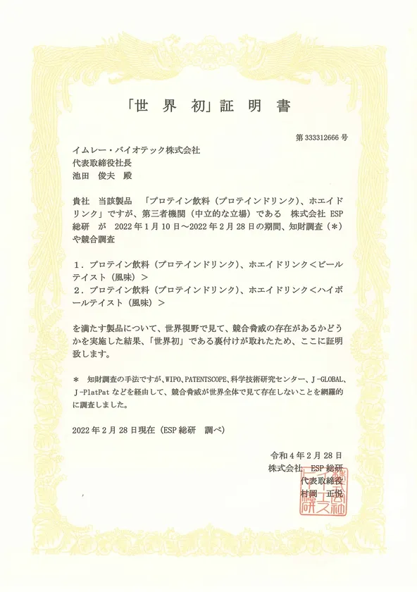 この度、イムレー・バイオテック株式会社(本社:福岡県福岡市博多区、代表取締役:池田 俊夫)は、BeRuleノンアルコールホエイドリンクが世界初のビールテイストプロテイン飲料とハイボールテイストプロテイン飲料に認定されたことをご案内いたします。