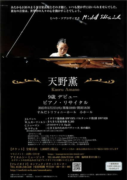 『天野薫 9歳デビュー ピアノ・リサイタル』が2023年5月2日(火) にすみだトリフォニーホール 小ホール(東京都墨田区)にて開催されます。チケットはカンフェティ(運営:ロングランプランニング株式会社、東京都新宿区、代表取締役:榑松 ⼤剛)にて12月10日(土)より発売開始です。