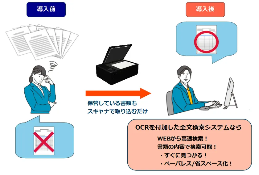 このように、OCR機能を付加した全文検索システムを導入することで、スキャナで取り込んだ紙の文書も検索できるようになり、ペーパーレス化を推進しつつ業務効率も向上することが可能です。