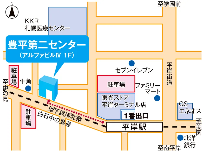 札幌市営地下鉄南北線「平岸」駅から徒歩2分、白石中の島通に面したビルの1階(旧豊平センター店舗)に、豊平第二センターとして出店します。(豊平センターは、2021年12月に、札幌市営地下鉄南北線「南平岸」駅 徒歩1分の立地に移転しております。)