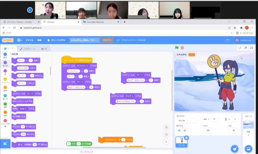 Scratchに拡張機能が加わった「Stretch3」と先ほどAIの学習で使った「Teachable Machine」を用いて、「コンピュータが絶対負けないじゃんけんゲーム」作りに挑戦しました。