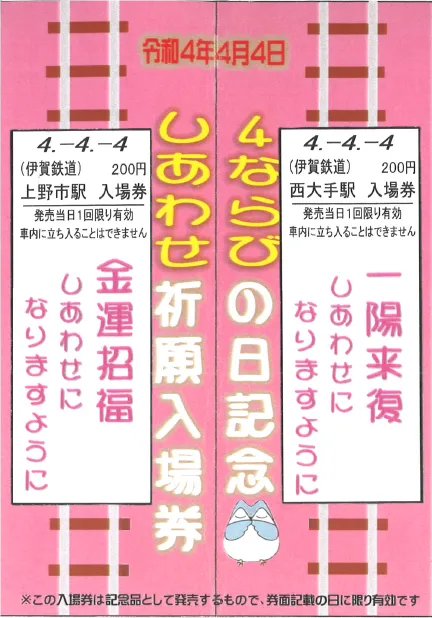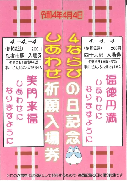 伊賀鉄道では、令和4年4月4日に「4ならび」となるのを記念して、4(し)の文字を記載した2枚の硬券タイプの入場券を特製台紙にセットした『しあわせ祈願入場券セット』を発売いたします。特製台紙は中央部分で二つ折りすると、2枚の入場券が合わさり、「し合せ(しあわせ)」をイメージしたものとなっています。