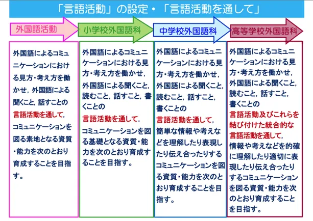 直山氏は、「学習指導要領を読んでもらうと、小学校中学年の外国語活動、小学校高学年の外国語科、中学校の外国語科、高等学校の外国語科、この4つすべての目標として共通して記されていることがあります。それは『言語活動を通して』ということばです。小学校における言語活動とは、実際に英語を使って自分の考えや気持ちを伝え合うことです。先生が “Repeat after me.” と言って子どもたちに繰り返し練習させることは、やってはいけないということではありませんし、言語活動を成り立たせるために練習も必要ですが、それが授業の中心になってはいけません。」と言います。
