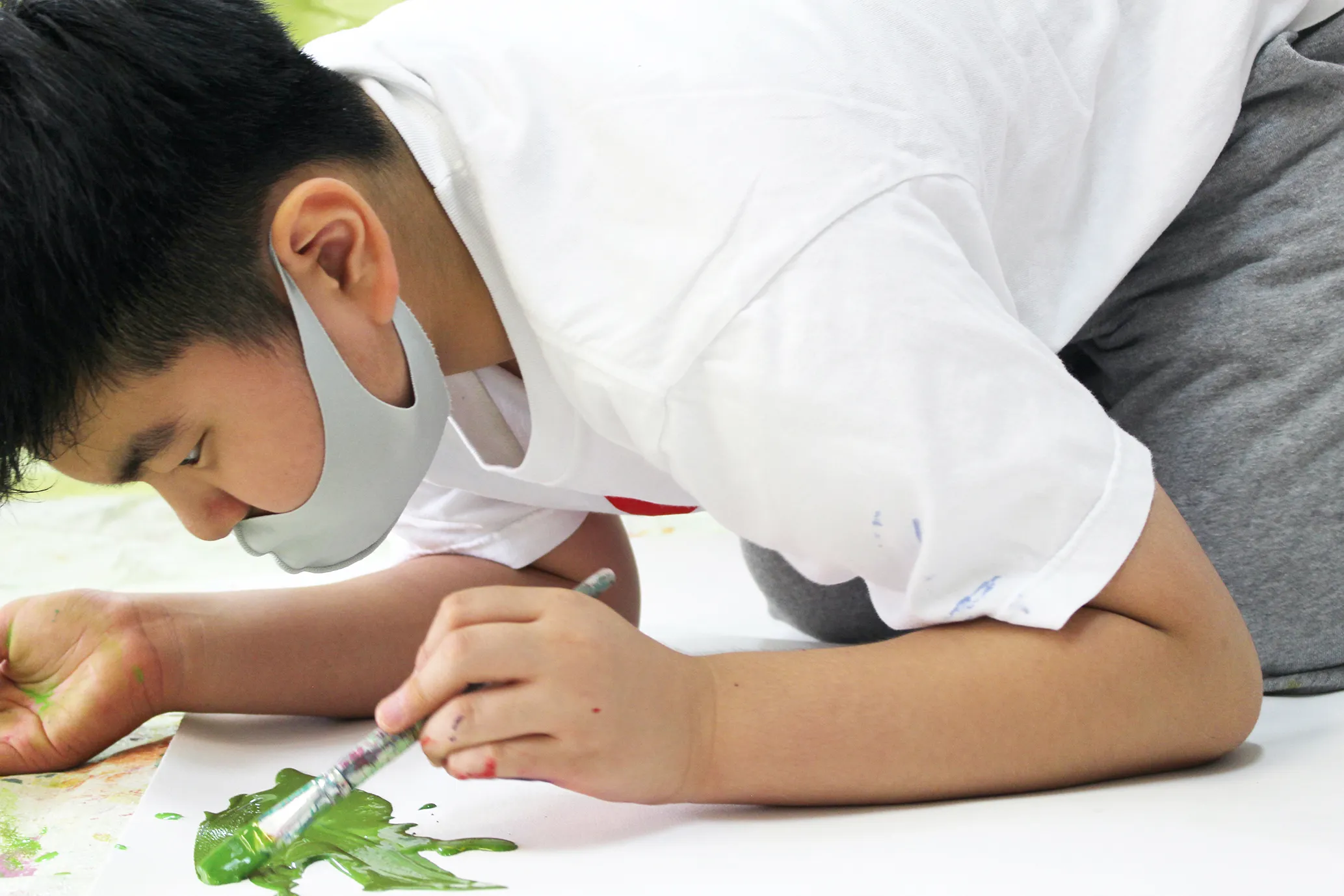 色彩感覚が豊かで絵の具が大好きな望海くんは、水を得た魚のように嬉々として大きな紙に色を広げる。その瞬間、望海くん自身が色彩の一部となったように見える。歓喜溢れる表情は創造の喜び。