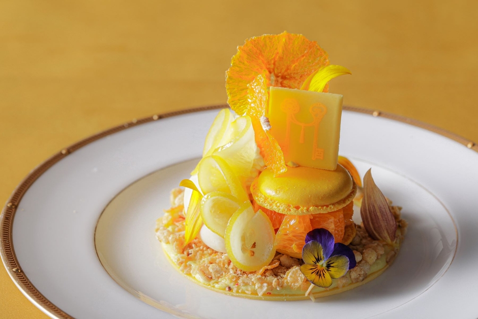 上段はミルクアイスやフレッシュオレンジのマカロン、ドライオレンジ、シロップ漬けレモン、エディブルフラワーを使用。下段はレモンのグラニテ、バタフライピーシロップ、シャンパンのジュレ、ブルーベリー、銀箔を使用。バタフライピーシロップとレモンのグラニテをかき混ぜることで、色がブルーからパープルに移り変わる仕様に。また、上段はレモンの板チョコとグラノーラの板により取り外しができるので、分けて楽しむことも可能。名古屋に来たら一度は食べるべき、煌びやかなご褒美スイーツを存分にお楽しみください。