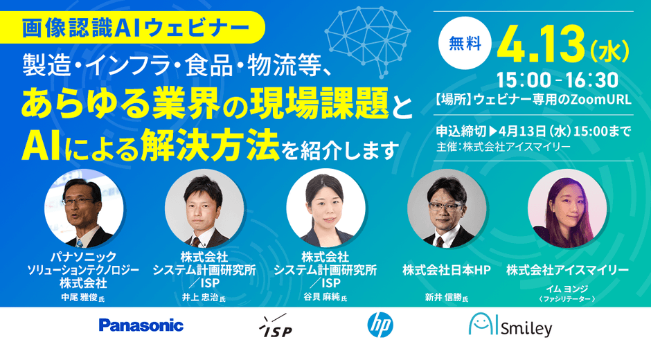 人工知能を搭載したサービスの資料請求ができるAIポータルメディア「AIsmiley」を運営するアイスマイリー(東京都渋谷区、代表取締役:板羽晃司)は、2022年4月13日(水)15時から「現場の課題解決に特化した画像認識AI」をテーマにウェビナーを開催します。