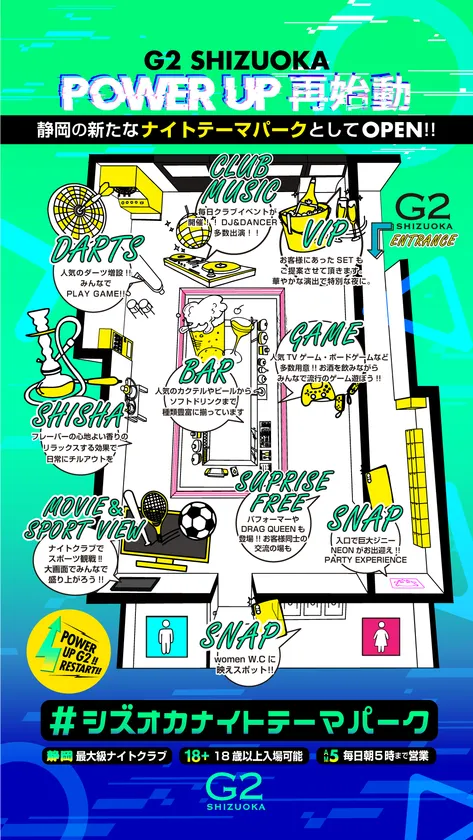 静岡最大級のナイトクラブ「G2 SHIZUOKA」が、あらゆるエンターテイメントを一度に楽しめる、静岡の新たな「ナイトテーマパーク」としてリニューアルオープン致します。