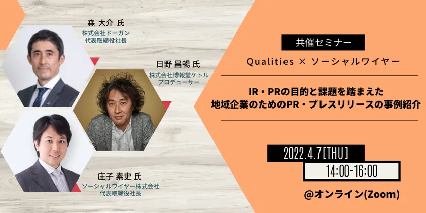 そこで、この度、Qualities IR・PR支援サービスの一環として、証券会員制法人 福岡証券取引所、株式会社東京証券取引所にご後援いただき、Qualitiesを展開する株式会社ドーガンとソーシャルワイヤー株式会社との共催イベント「IR・PRの目的と課題を踏まえた 地域企業のためのPR・プレスリリースの事例紹介」ウェビナーを4月7日14時より開催いたします。