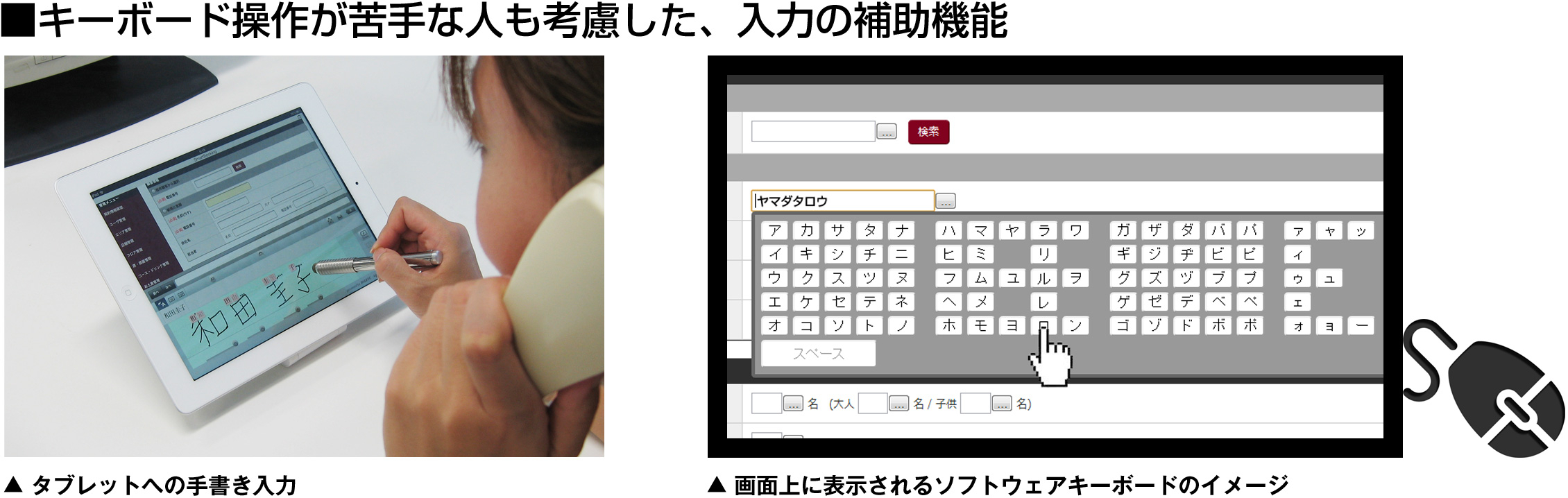 また、ソフトウェアキーボード・テンキーを採用したことにより、PCリテラシーの低いスタッフでも、お電話で予約を受けながら、マウス片手に簡単入力操作を可能にしました。