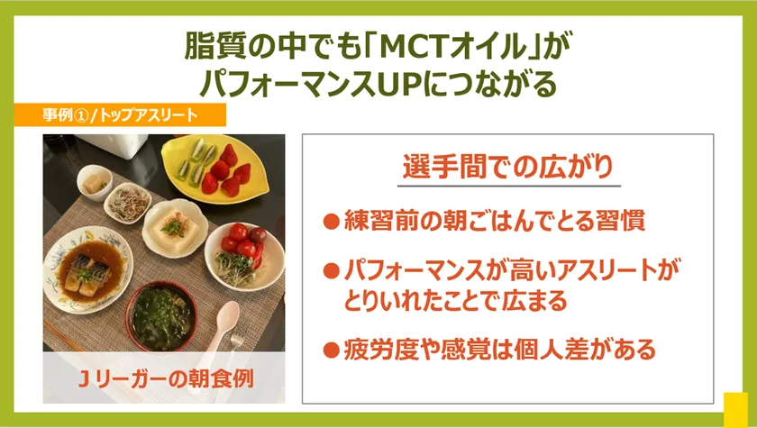 朝食というと「砂糖入りのコーヒー」「おにぎり」「パン」のように、“とりあえず糖質”を摂る方が多いのではないでしょうか。「脳のエネルギー=糖質」と捉えがちですが、実は脂質も重要な脳のエネルギー源です。中でもMCTオイルはほかの脂質と異なり、素早くエネルギーになるケトン体を作り出す特長があることから、アスリートの食事指導に取り入れています。また、朝に摂ることで、作り出したエネルギーを日中に効率よく使うことができるため、仕事で集中力や判断力が必要となるビジネスパーソンにもぜひおすすめしたいです。