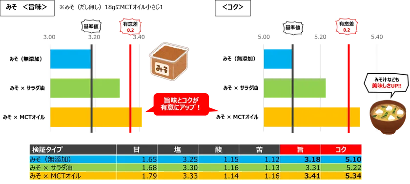 その結果、検証した全ての食材でMCTオイルを加えることによる有意差が確認されました※5。いずれもコクや旨味がアップすることで「美味しさ」に寄与しているほか、ヨーグルトの酸味や温野菜の苦味を低減させる効果が見られたため、より食べやすくなると言えるでしょう。以上のことから「MCTオイル」は、無味無臭なため日常の食事にプラスしやすく、様々な食事の美味しさを高めることが期待できると示唆されます。