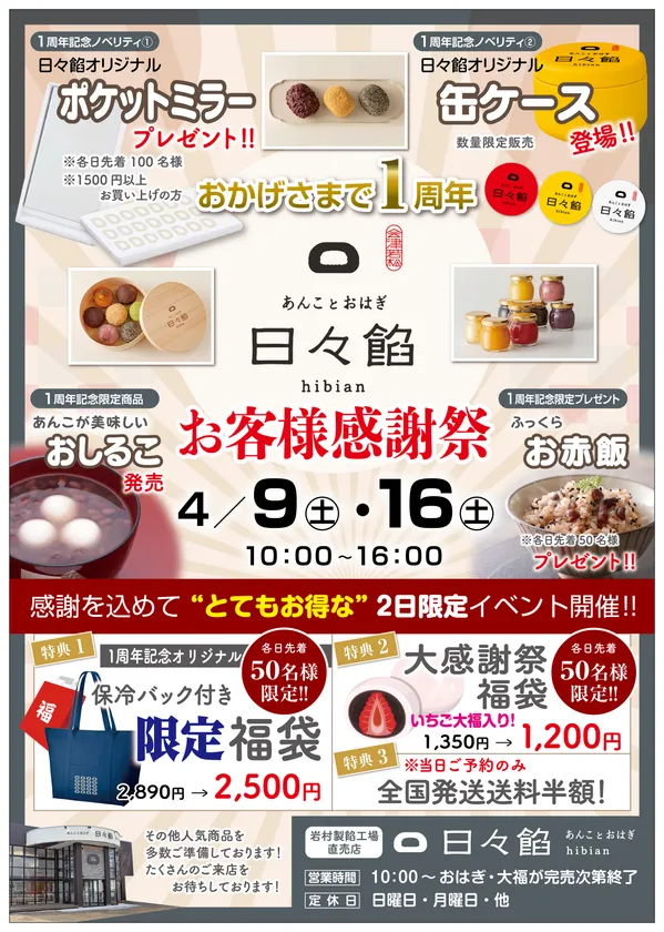 この1年間、地元会津若松市のお客様を中心に、福島県内のお客様にたくさんのご来店をいただき、「あんことおはぎ 日々餡」を支えていただきました。その感謝の気持ちを込めて、4月9日、16日の2日間にわたり“お客様大感謝祭”を開催いたします。