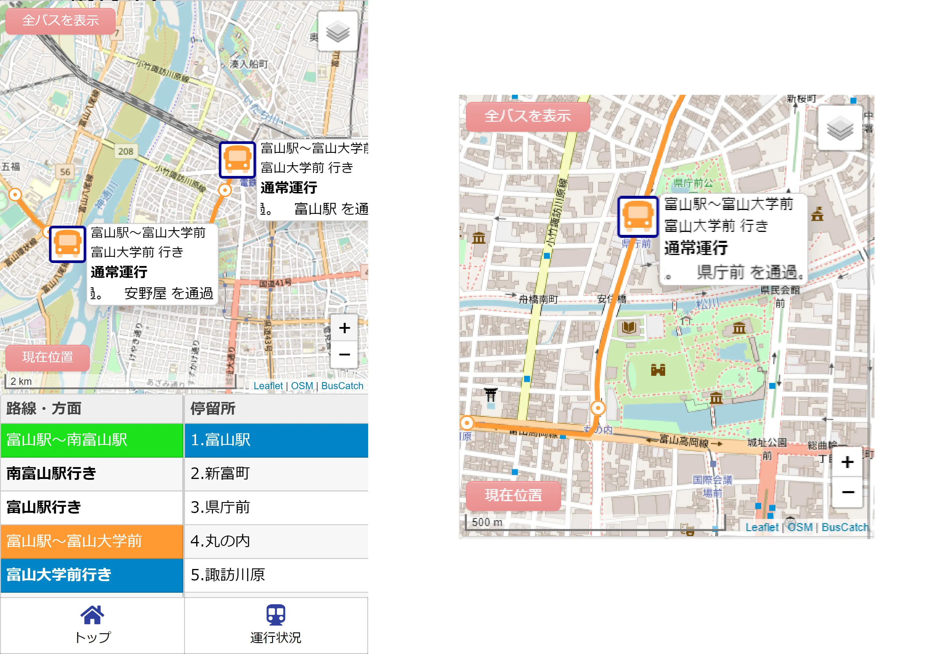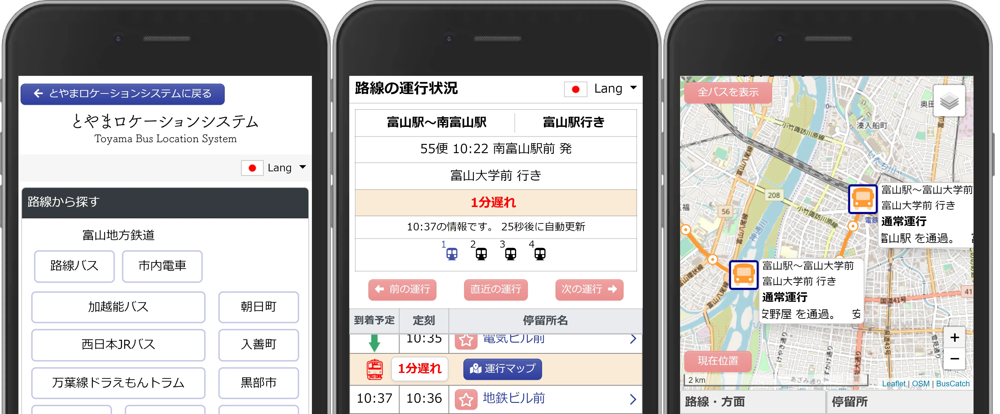 「とやまロケーションシステム」は、Webサイト上で目的地までの経路検索とバスの現在位置や運行状況などのリアルタイム情報をワンストップで確認できるサービスであり、2019年11月18日(月)よりヴァル研究所の提供する「VTM(Val Transfort Manager)」及びVISH株式会社が提供する「BUS CATCH(バスキャッチ)」にて運用を開始しております。運行状況については富山県内の路線バス・コミュニティバスに対応しておりましたが、この度富山市内を運行する富山地方鉄道市内電車に対応いたしました。