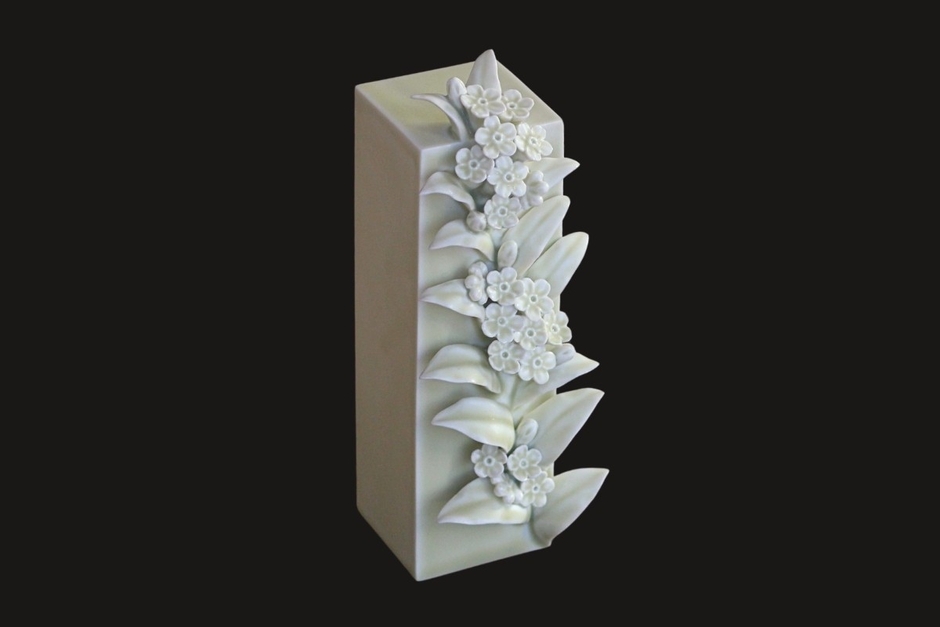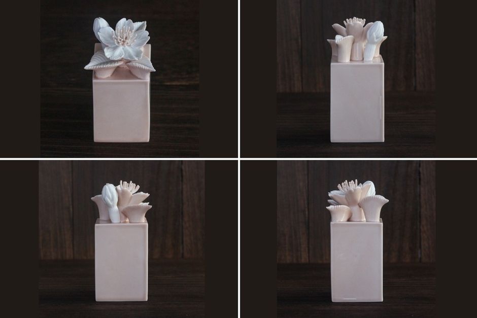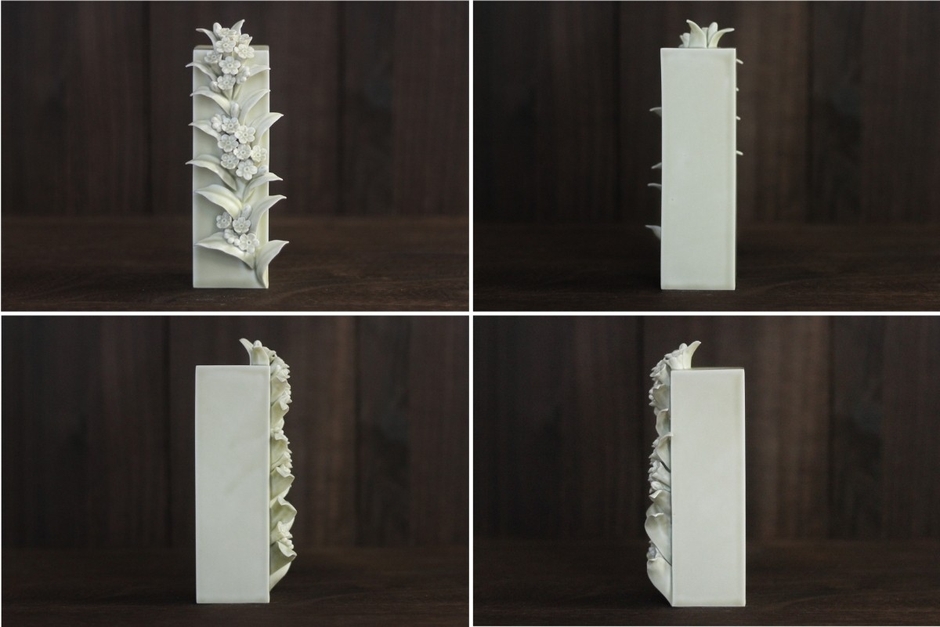 本作は、磁器という素材を用い、作家自身が制作した型によって成形を行った後、