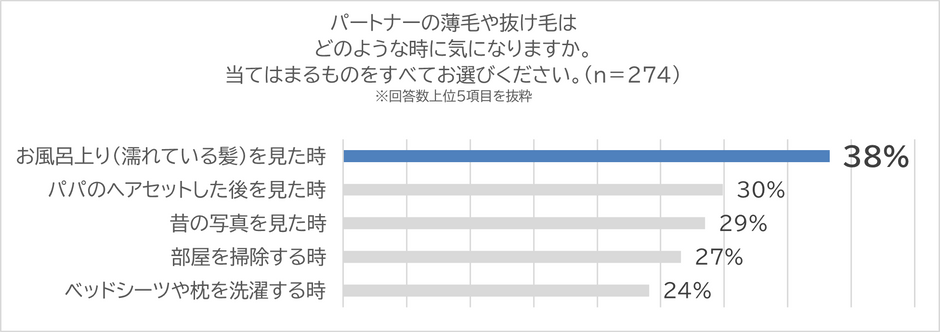 さらに、「パパの薄毛・抜け毛がどのような時に気になったのか」をお聞きしたところ、「お風呂上がり(濡れている髪)を見た時」が38%と最も多く、「ヘアセット後」「昔の写真を見たとき」などの回答が続き、ふとした瞬間にパートナーの薄毛や抜け毛が気になっていることがわかりました。