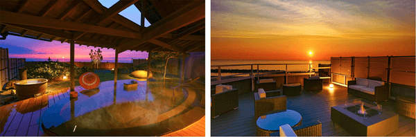 右:ロビーから続く夕映えテラス>にはテーブルとチェアをご用意しています。刻一刻とその表情を変えながら遮るもの無く水平線に沈む夕日に、自然の偉大さを改めて感じるひと時をお過ごしください。(冬季、悪天候時はクローズ)