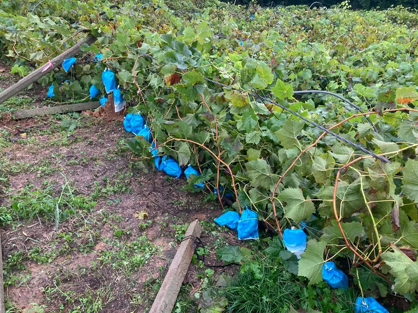 2021年8月の旬を迎えた頃、稀に見る豪雨・長雨によってぶどう棚が倒壊し、ぶどうの樹々は倒れ収穫直前のぶどう達(シャインマスカット・ピオーネ)が樹ごと地面に落ちてしまいました。原因は、棚のワイヤーを支えていた地中のアンカーが土壌の流失で抜けてしまった事によるものでした。棚はワイヤーで吊っているためドミノ倒しの様に倒壊が広がり、被害は1万房にも及びました。