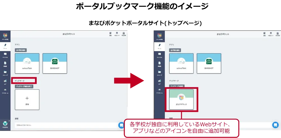 「まなびポケット」ポータルサイトのトップページに、各学校が独自に利用するWEBサイトやWEBアプリケーションのURLリンクをブックマークできる機能を提供します。これにより、まなびポケット上で利用する学習コンテンツ以外も含めた、学習の総合ポータルサイトとしてご利用いただけます。