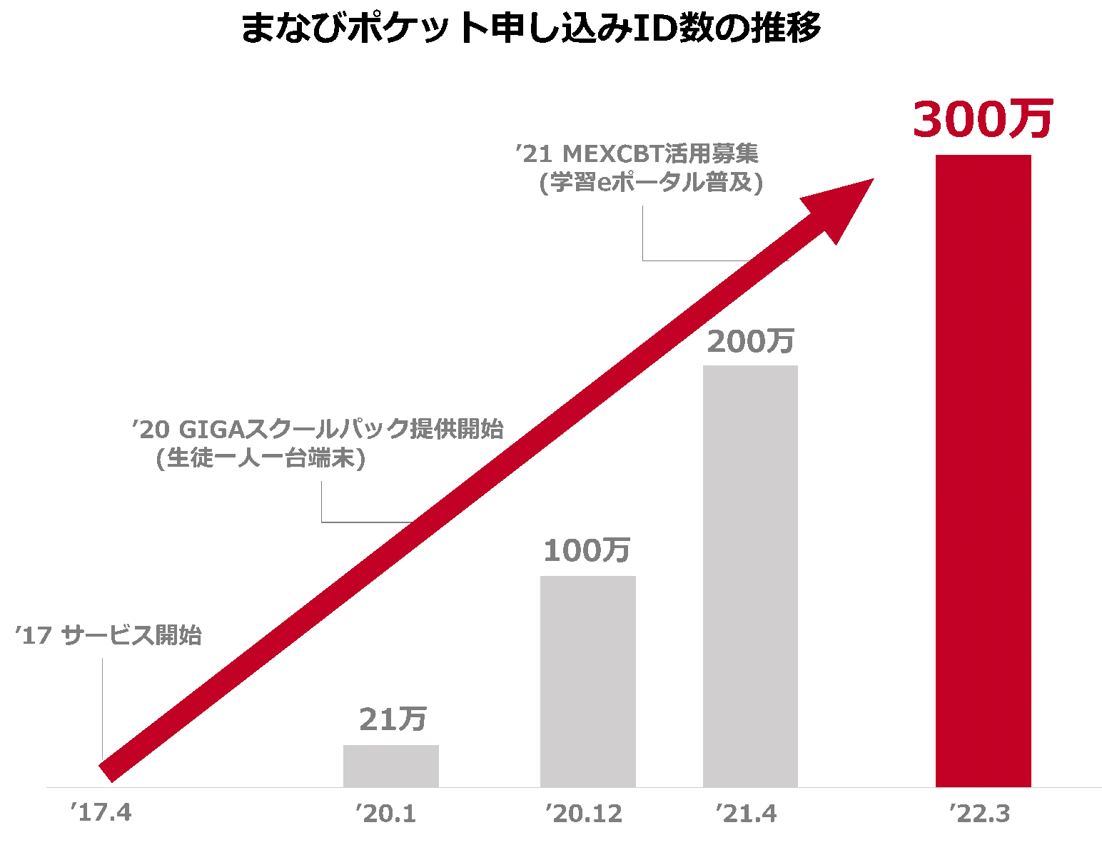 この様な背景の中、「まなびポケット」は2022年3月時点で700以上の自治体、8,000校以上の学校よりお申し込みをいただき、300万IDを突破しました。