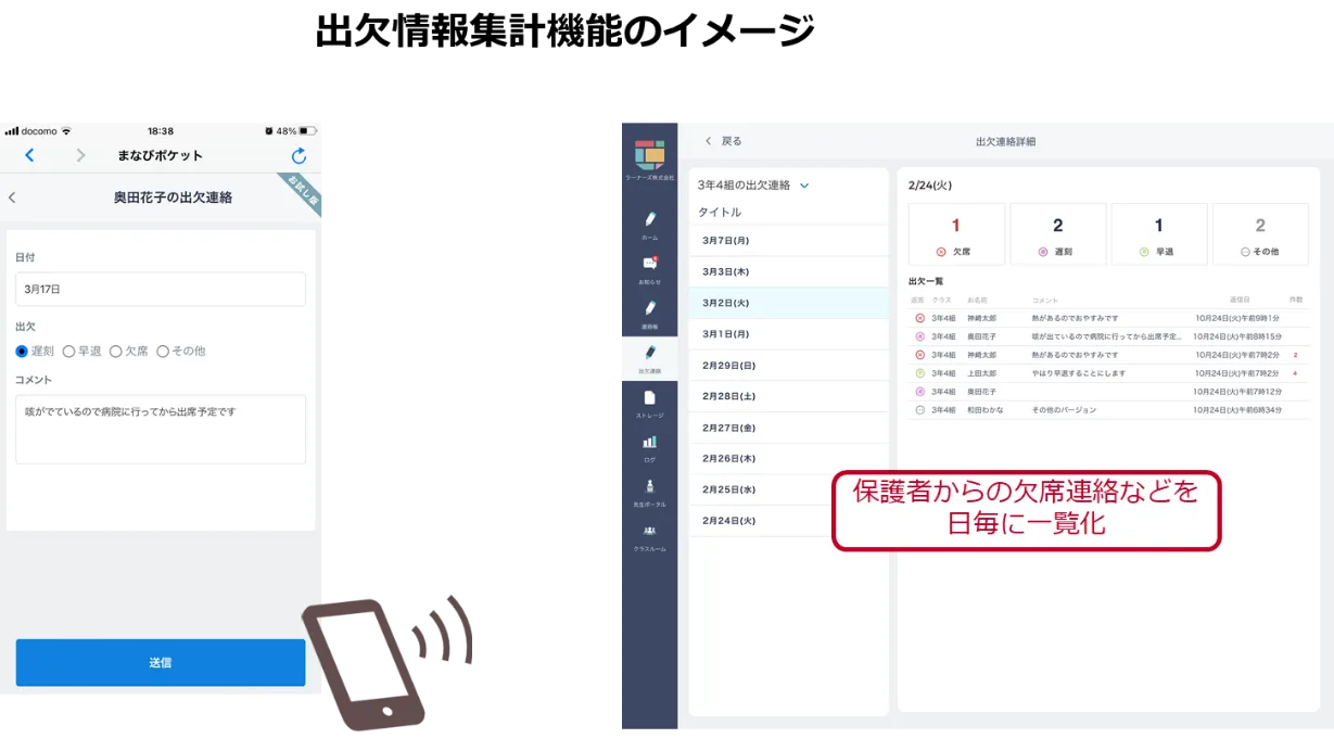 保護者からの出欠連絡等を、先生が日毎に一覧で確認できる機能を提供します。紙の連絡帳や電話による出欠連絡からデジタル化することで、保護者はいつでもスマートフォンから出欠連絡等を行うことができます。また、先生は出欠連絡の集計結果をいつでも把握可能となり、ワークスタイル変革にも貢献します。