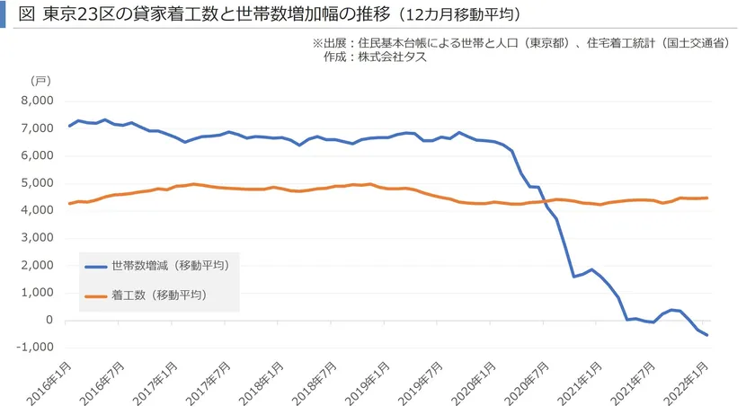 先月号において、市況分析から、2021年第4四半期の首都圏の賃貸住宅市場が全面的に回復傾向となったことを報告しました。一方で、東京23区の貸家着工数と世帯数増減の推移からは、感染拡大開始後に世帯数増減が大きく減少したのに対し、貸家着工数は横ばいで推移しています。2021年第4四半期においても、この状況は少しも変わっていなません。むしろ悪化しています。