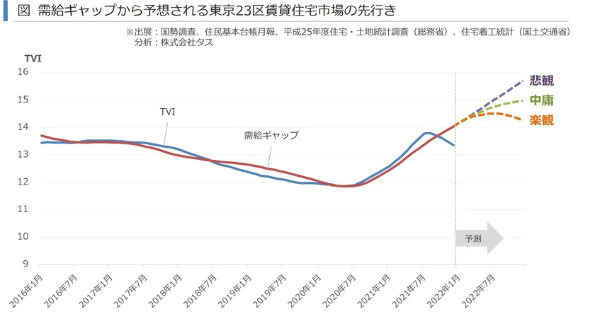 本当の意味で、東京23区賃貸住宅が安定するのは、公開データから算出される需給ギャップが回復を始める状況になってからでしょう。東京23区の需給ギャップ分析(「悲観」:2022年の東京23区の世帯数増減が2021年と同等、「楽観」:世帯数増減がコロナ前の2019年と同等、「中庸」:世帯数増減が2019年と2021年の平均で推移)からは、「悲観」ケースの場合は需給ギャップが2022年も拡大を継続、「楽観」ケースでは、2022年の第4四半期には需給ギャップが縮小、「中庸」ケースでは需給ギャップの拡大幅が縮小しますが2022年中はギャップの拡大が続くことが予測できます。