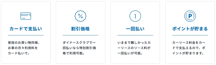 また、昨今ウェブやクレジットカードなどの利用で獲得できるポイントが、自動車のリースという比較的高額な費用にも適用となり、ポイントが貯められるようになることも大変魅力的です。さらにご利用期間分のリース料金全額をダイナースクラブカードで一括(1回)払いしていただくと特別価格でご提供でき、大変お得になります。