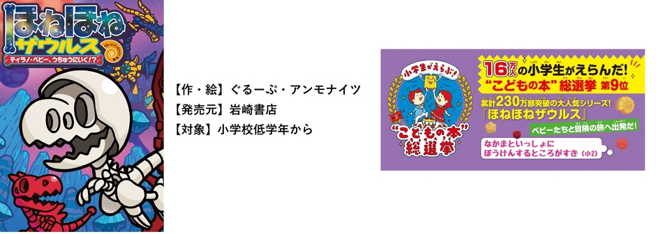 2008年5月に岩崎書店により児童書として登場。現在まで第25巻まで刊行されており、累計230万部を突破しております。2021年に開催された「第3回小学生がえらぶ!こどもの本総選挙」にて9位入賞を果たしました。主人公は、ティラノサウルスの「ティラノ・ベビー」、親友のトリケラトプスの「トップス」、ステゴザウルスの「ゴンちゃん」。最新25巻は、舞台を宇宙に飛び出しての大冒険ストーリーです。