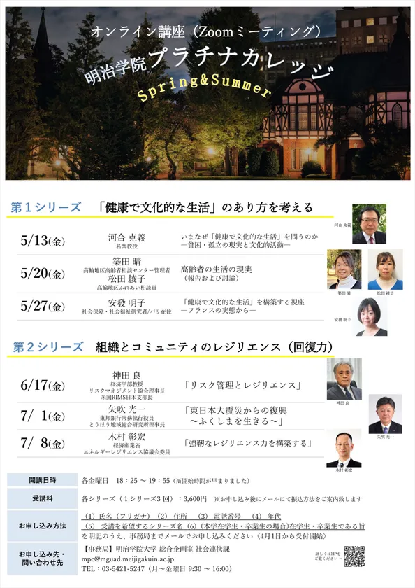 誰もが営む権利を有する「健康で文化的な生活」について文化の観点から考える講座、また、組織やコミュニティが生き抜く上で必要な「レジリエンス」をひもとく講座をお届けいたします。明治学院大学の名誉教授を中心とした講師陣が講義します。