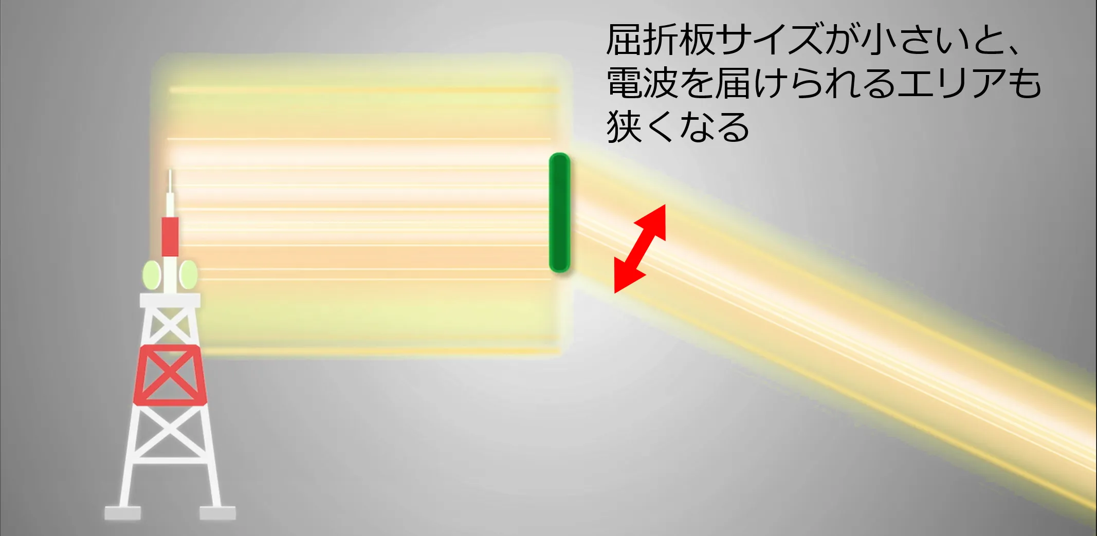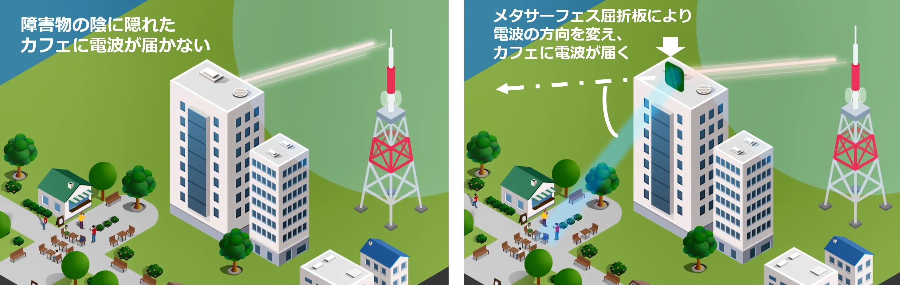 現在、景観に配慮した透明タイプの屈折板や、特定の場所に電波を集束させ受信電力を向上させる技術改良を重ねています。また、今後は端末の状況に応じて電波の向きを変えられるRIS (Reconfigurable Intelligent Surface)※の実現も目指してまいります。