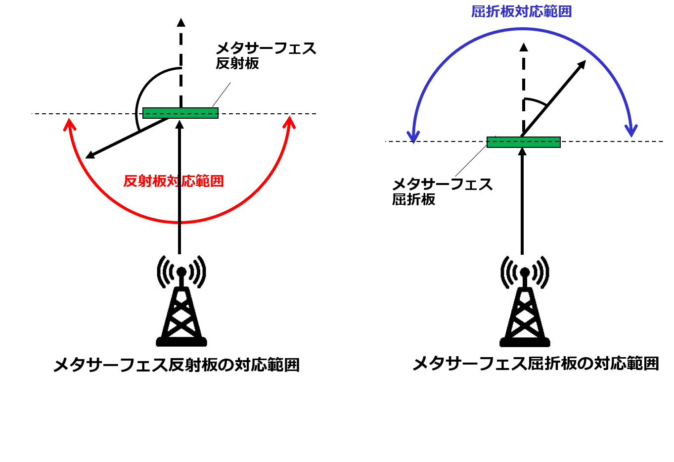 従来型のメタサーフェス反射板は、反射板より手前側に、電波の進行方向に対して大きな角度で曲げる場合には有利ですが、向こう側に小さな角度で曲げる場合には向きません。それに対しメタサーフェス屈折板は、小さな角度で曲げる場合に有利で、障害物を回避するような使い方に向いています。反射板に加えて今回当社が開発したメタサーフェス屈折板を用いることで、電波を曲げる範囲を拡大し、 5Gサービスエリアをさらに拡大することが可能となります。