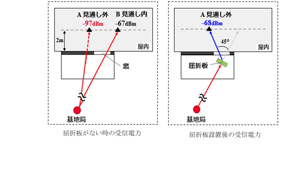 建物の壁が障害となり、屋外に設置された基地局からの見通しが得られず受信電力が低いA地点(受信電力:-97dBm)と、窓を通して基地局を見通すことができ受信電力が高いB地点(受信電力:-67dBm)の2か所に端末を設置しました。窓の外の踊り場に、A地点に電波を届けるようメタサーフェス屈折板を設置すると、A地点での受信電力は-68dBmとなり、見通し内と同程度の受信電力が得られ、メタサーフェス屈折板の有効性が確認できました。