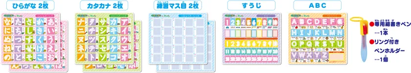 すうじ(1枚)、ABC(1枚)、専用細書きペン(1本)、