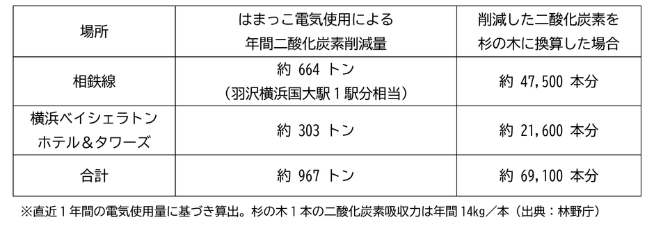 この導入により、相鉄新横浜線(区間:西谷駅~新横浜駅)の全線開業(2023年3月予定)でさらに便利になる相鉄線 羽沢横浜国大駅で使用する電気相当量と、横浜ベイシェラトン ホテル&タワーズで使用する電気の一部について、二酸化炭素排出量実質ゼロを実現し、両社で年間約967トン※1(杉の木約69,100本相当※2)の二酸化炭素の排出を削減します。