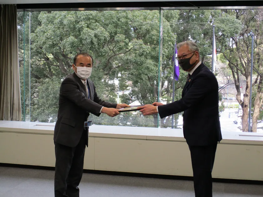 永次会長(右)から濱口課長(左)へ贈呈