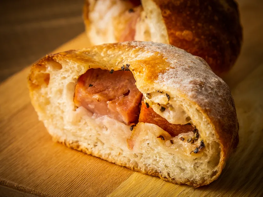 米粉と湯種をミックスし、独自の低温熟成製法で、独特のもちもち感がたまらないパンが出来上がりました。見た目はハード系ですが、生食でも美味しく食べれるパンです。