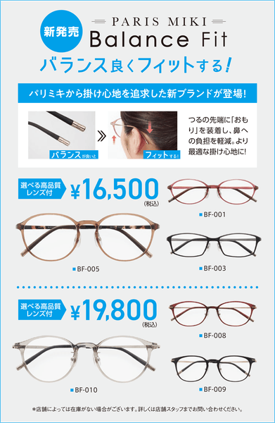 つるの両先端に「おもり」を装着することにより、レンズとの重心がつり合うよう設計された新しいフレームです。重心が耳の後ろに移動することでフレームのズレや疲れが軽減され、安定した快適な掛け心地を実現します。この機会にお近くのパリミキでお試しください!