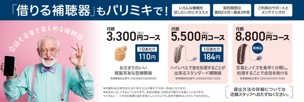 月額税込3,300円~ 定額にて補聴器を貸し出しいたします。使えるようになるか不安な方は、まずは補聴器を借りることから始めてみませんか? また、ご購入をご希望の場合は両耳84,000円(非課税)~ お求めいただけます。