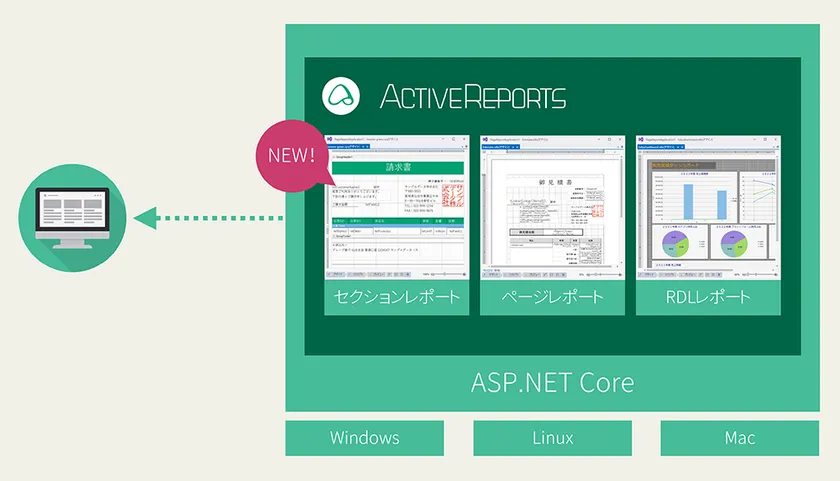 また、セクションレポートがASP.NET Coreに対応しました。これにより、すべてのレポート形式でJSビューワやPDFエクスポート機能を使用して帳票の表示・出力が可能となります。アプリケーションの運用環境としてはWindowsやLinux、Mac環境をサポートしているため、クロスプラットフォームで利用できます。