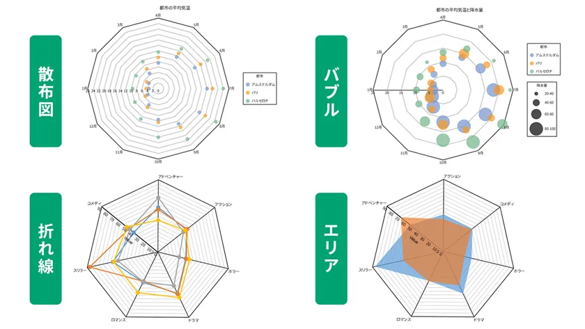 複数項目のデータを直感的に比較することができ、データ同士のバランスや特徴を見たい場合などに最適です。